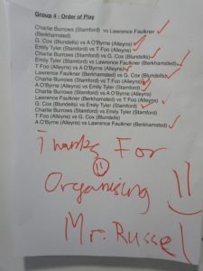 In the doubles, Fienberg then paired up with Faulkner to convincingly take down Alleyn’s in the final. It had been an incredibly impressive showing by the Alleyn’s pair of Zheng & Dorokhov, who made it to the final despite only being the 2rd pair at their school by beating Stamford 1 11-9 in the semi-finals, which was the game of the tournament. Stamford are no doubt now within touching distance of getting their hands on the top prize, having been the most consistent school at U13 level for the past 3 years.