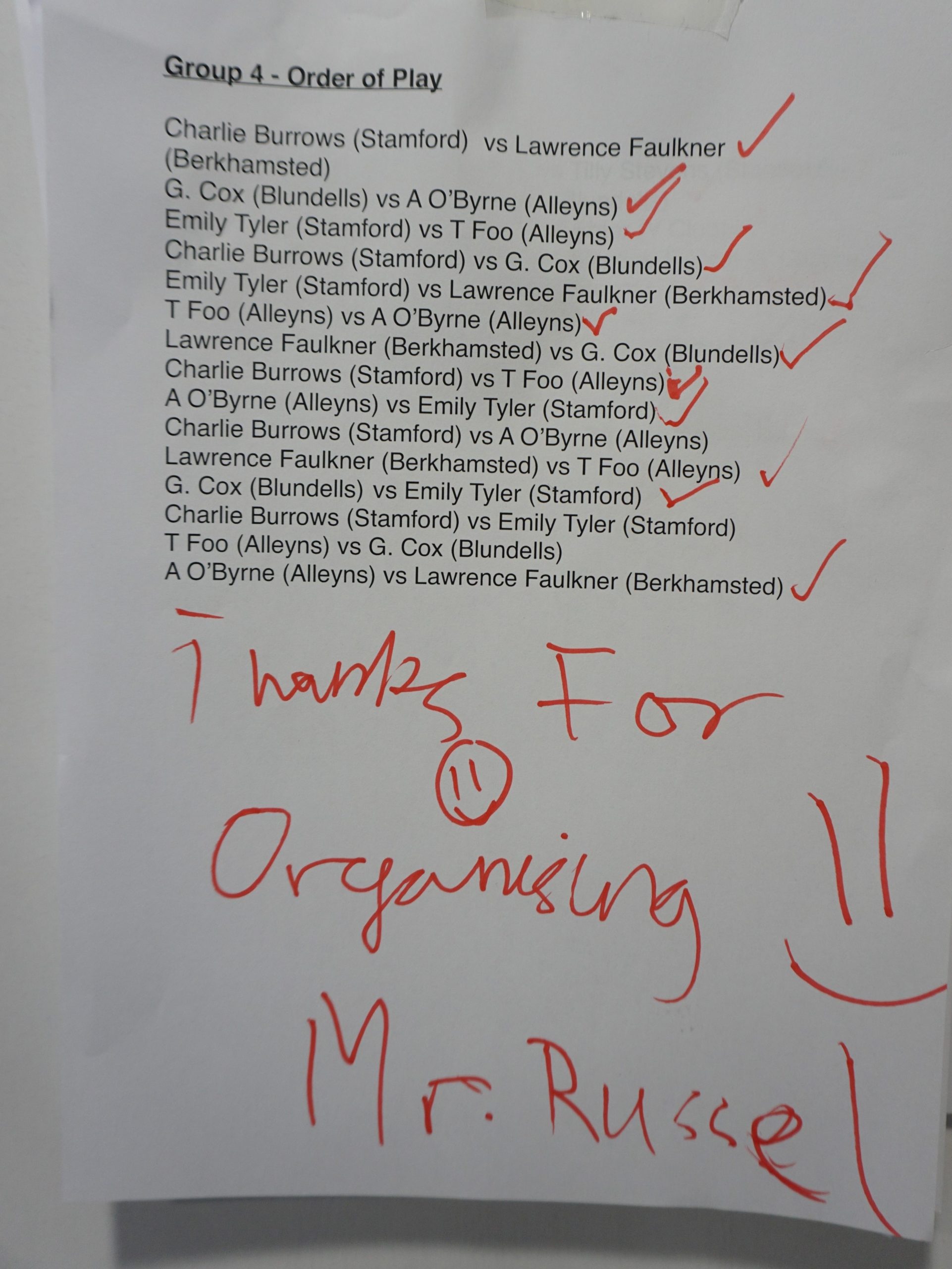 Group 4: 1st L Faulkner (Berk); 2nd C Burrows (Stam); 3rd T Foo (All). Also played: G Cox (Blu), A O’Byrne (All), E Tyler (Stam)