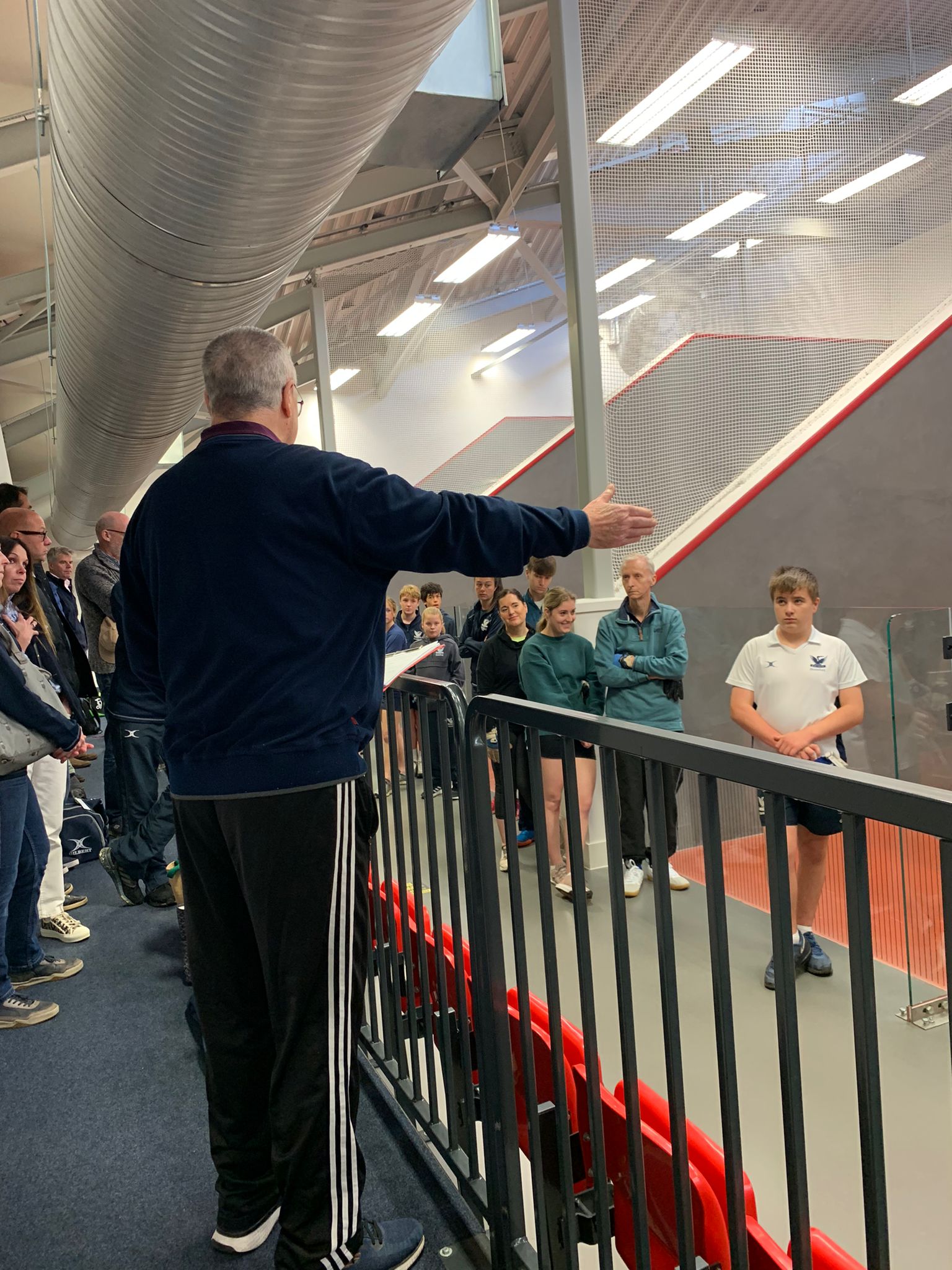 The day began with 90 minutes of friendly games to help the players get to know each other and acclimatise to the glass-backed courts. After lunch three different groups were set up and scores recorded, from which it was possible to allot players to three separate competitions, reflecting their relative standard.