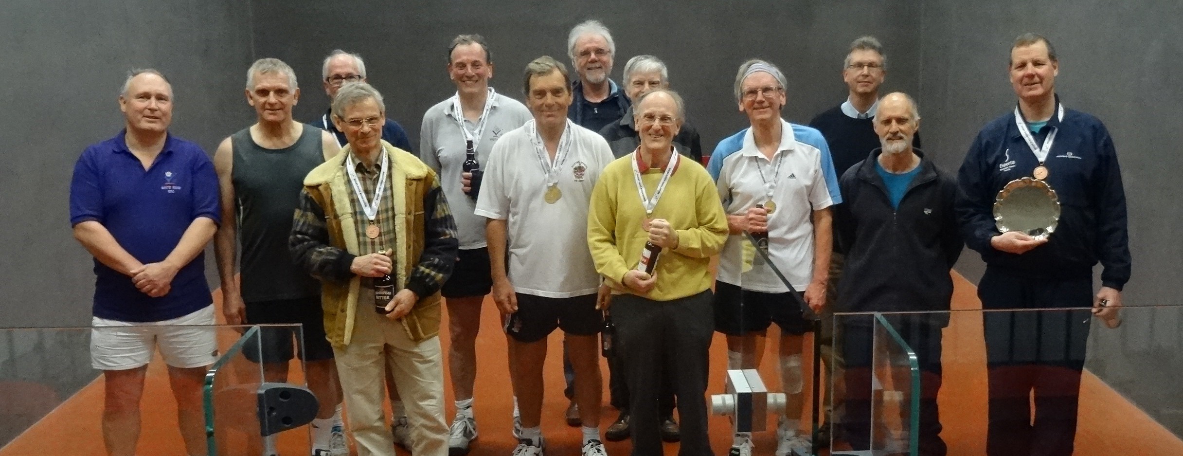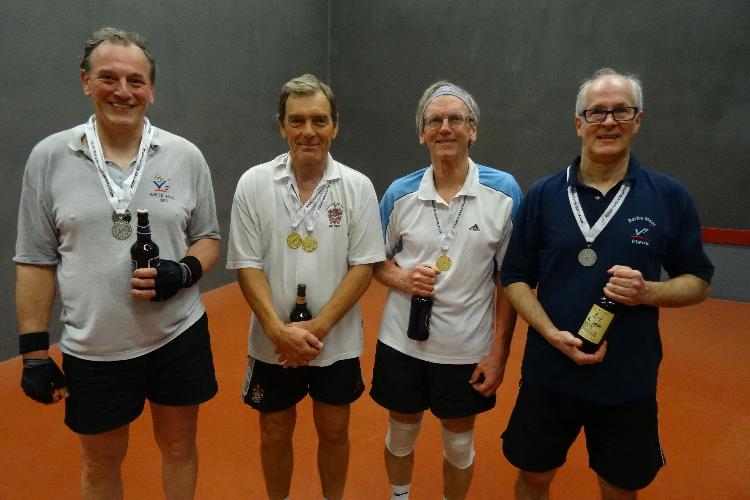 The Singles began with two pools of three players fighting for the chance to play in a semi-final and then a final. Ian Fuller forged ahead in pool one, comprehensively winning both his matches against Messrs. Phil Atkinson and Tony Hamilton. The second pool sported new entrant, Neil Roberts, who won both his games against Stuart Kirby and then Dickie Warner. In the semi-final Ian beat Stuart and Neil Tony, leading to a much anticipated final. Despite Neil’s court dominance, Ian’s consistency and accurately placed shots took their toll, with him winning relatively easily by 15-9. Who is capable of breaking Ian’s dominance in this category, we speculated.