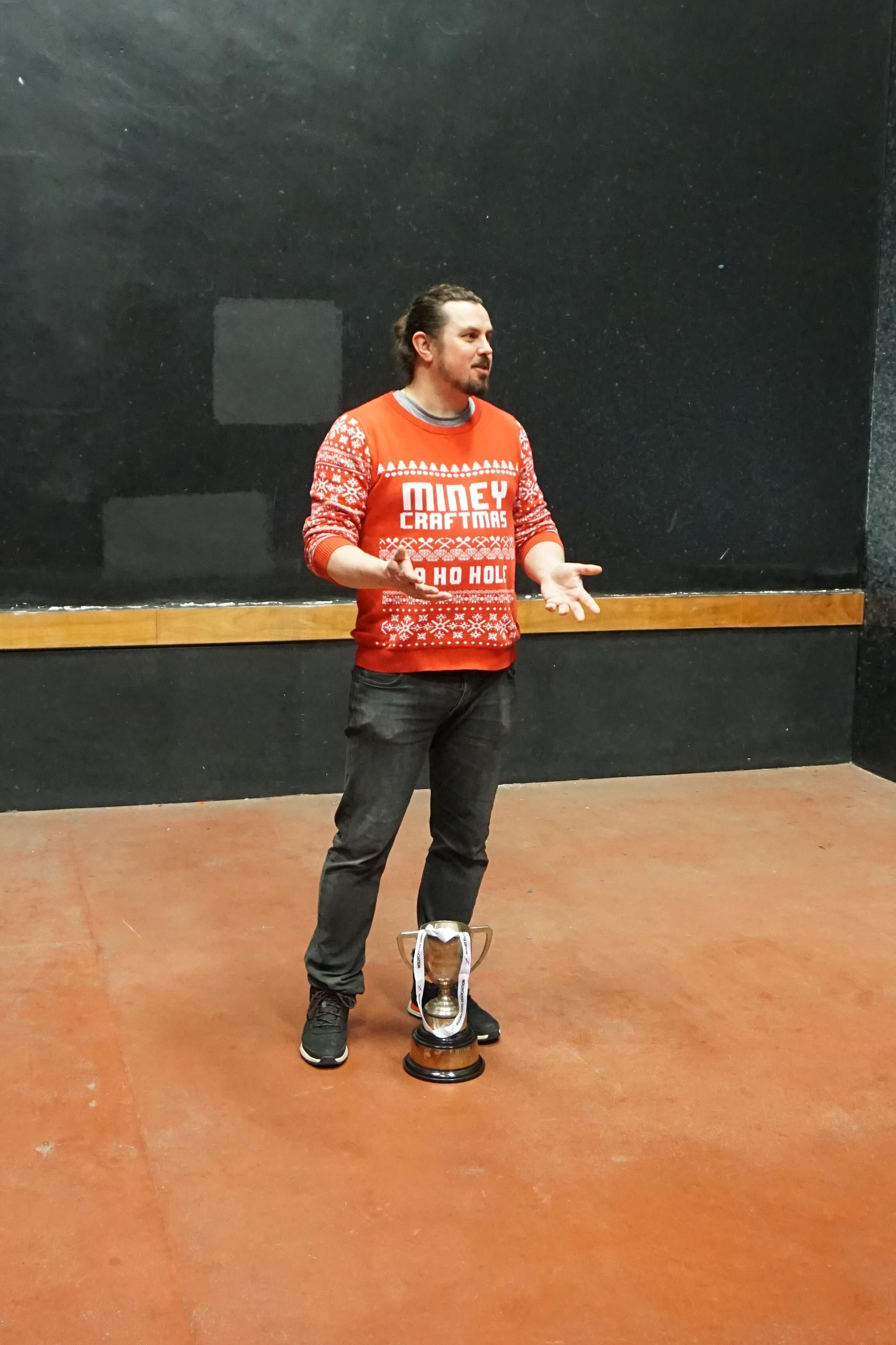 Then came the showpiece finale. As they showed in the earlier rounds, few players can live with Dan and Ed, and those on the balcony were left in awe as they raised their game to another level. Their pace of play is breathtaking and range of shots spectacular. They both have an equal willingness to take risks for the chance to sap opponents’ energy, which is countered by each others’ anticipation and seemingly impossible retrieval — their speed around the court is phenomenal. Dan emerged victorious, 16-14 in the second, but Ed is only a gnat’s whisker behind.