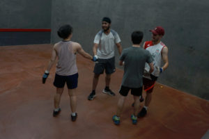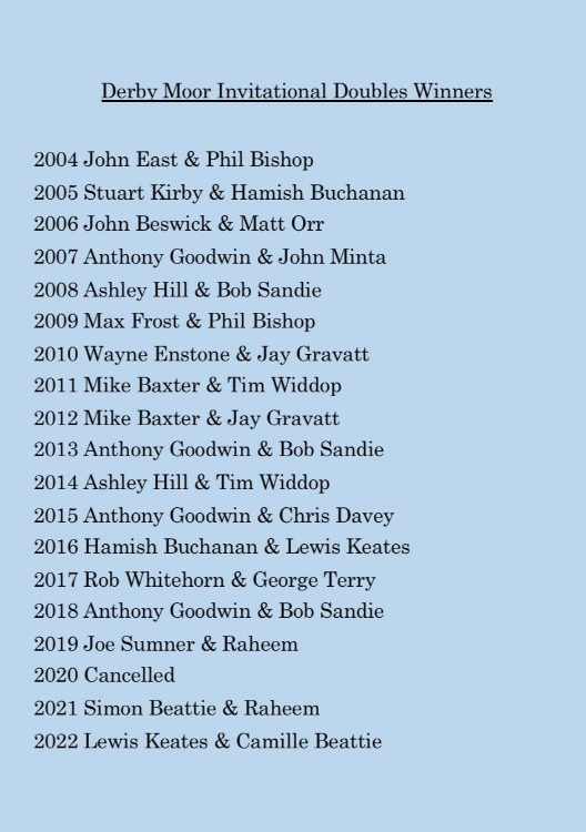 STOP PRESS As usual Brian Kirk organised a superb full day’s Fives, with 6 different competitions played out by the end of the afternoon. With guests in action from Berkhamsted, Durham and Manchester, as well as old friends and several home players, there were new names to be added to the Roll of Honour: Camille Beattie the first female to win the main competition; Vishal Singh making his first final; Dan Swinbank and Adam Hicks from Durham meeting in one plate final; young Val Fikhter from Manchester winning the main plate trophy in his first adult tournament; RFA General Secretary Chris Blakeley marking his first visit to Derby Moor with a win in the seniors contest.