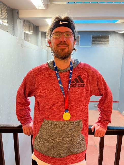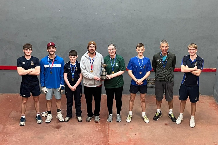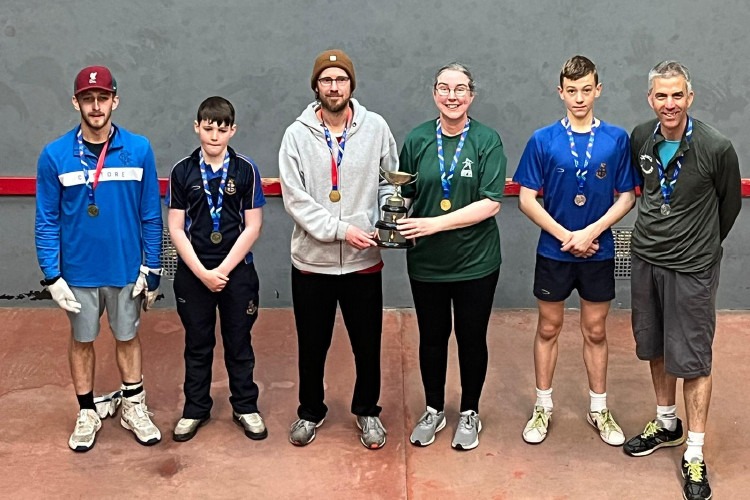 STOP PRESS There was a series of firsts recorded at this year’s Scottish Open: Richie Murby won his first Singles title, denying Dan Grant his first; RFA President Julie McIntyre won her first title, the Doubles with Richie — a double first for him –, and it is likely that she became the first sitting President of the RFA to win a maiden title, while also surely being the first mother to follow her son in winning that event, Oscar McIntyre having won it last year. Richie and Julie’s win must also be the first case of a mixed pair winning a regional open event. Strathallan School, who are playing their Fives on squash courts, recorded their first medal-winning performance, with Eric M teaming up with Derby Moor’s Lewis Keates to win the Doubles Plate, while Edinburgh Academy’s Findlay S won the Singles Plate.