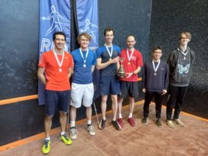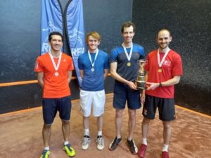 Highlights of the Singles were a three-gamer between Tom Watkinson and Sam Russell and what some deemed an upset when Richie Murby beat Julian Aquilina in straight games. Neither winner could match Ben Beltrami or Ed Kay in the semi-finals, however, and in the final Ben found, not for the first time, that Ed simply got better as their match progressed. The Plate final was an all-Uni contest between Nathan Jerome-Armah, back on court after a long break from the game, and Will Hanley, who won his “best ever singles game”.