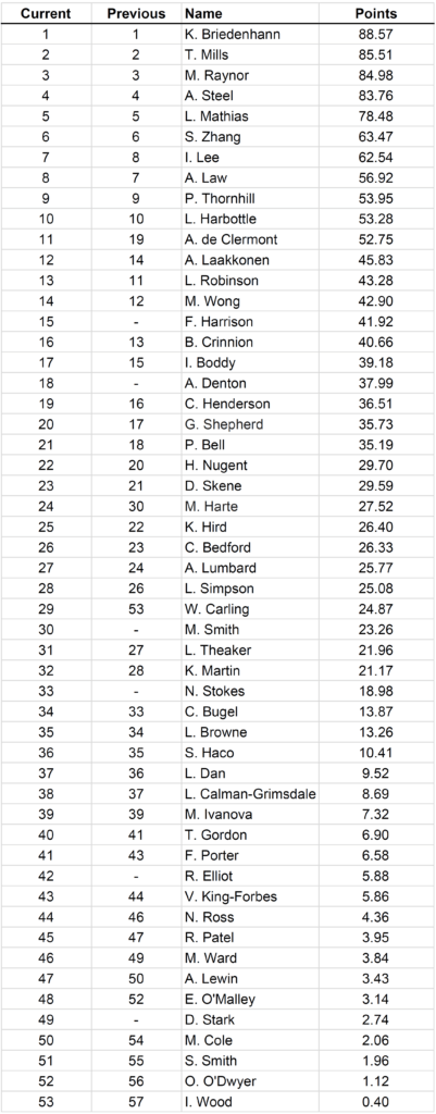 There are new entries: Freya Harrison and Arte Denton from Rugby School enter the top 20, while Meryl Smith of Edinburgh Academy makes spot number 30. Three other schoolgirls enter for the first time.
