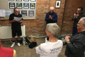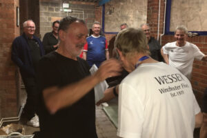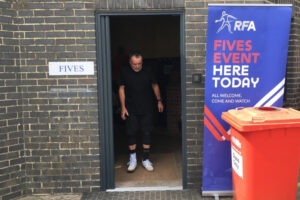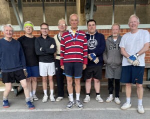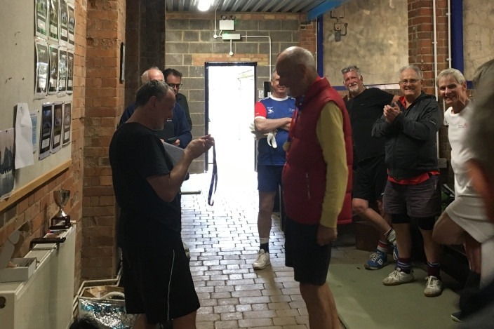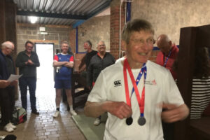 STOP PRESS It was all change in the Masters (65+) and Grand Masters (75+) as we saw competitions without the late Tony Hamilton, his long-standing partner Spencer Beal and multiple title-holder Bernard Atkinson. This opened the door to Stuart Kirby & organiser Brian Kirk to win the Masters trophy in a four-pair round robin and for Neil Arnott & Chris Horrocks to have their names added to the records for the Grand Masters Championship at the expense of Bev Boag & Giles Stimson. To afford the assembled players from both competitions some further convivial Fives Brian organised a Legends’ Grande Mêlée composed of 7 random pairs, from which a final emerged between John East & Leslie Jenkinson and a victorious Chris Blakeley & Andy Passey.