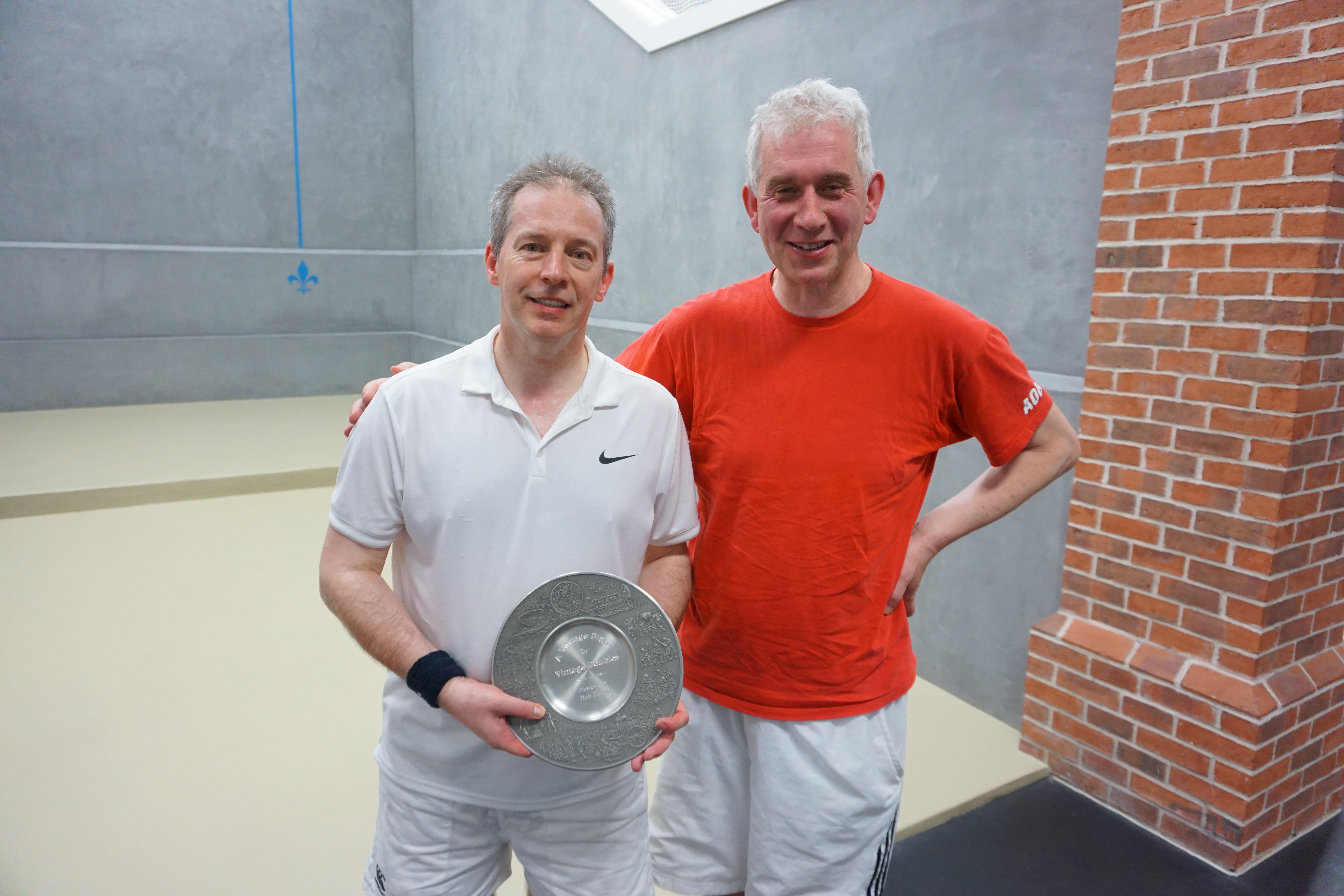 Tony Burrows, Bernard Atkinson, Keith Kennerley, Chris Blakeley, Spencer Beal and Mark Kiteley joined in for the doubles. We missed Tony Hamilton, who had to withdraw from the Singles with a tender hamstring so as to improve his chances of defending the Masters title next week with Spencer. Stuart, Ian and Richard all showed signs of fatigue as the final stages were played out — not surprising, with 12-11 a popular score! — and so the power and speed which Morgan Spillane generated with his left hand ultimately proved to be decisive. So, new champions all round, though history repeated itself in the Doubles Plate, where Angus & Nick successfully retained the pewterware!