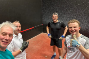Meanwhile on Court 2 what can be loosely termed to be a Mixed Doubles tournament was held for the Ted Isaacs Trophy. Here we saw a welcome return to the fixture by Rustom Irani and a first ever appearance by Sean Egan, plus a more familiar sight in Jon Abecassis and Rupert Mathieu, these four triumphantly representing the non-playing-Gareth-Quarry team, while Ian Steed & Helena Tunks plus Stuart Kirby & Richard Kemp honoured the spirit of the match’s name.