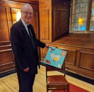 60 people attended the Dinner. After the predictably delicious meal “a few words” were spoken, firstly by the new President, Gareth Quarry, who spoke with great generosity of his predecessor’s 35 years of involvement in running the fixture, asking Ian Jackson to present Bob with an impressive original Fives-themed artwork (see below) to complement a trophy awarded him last year.