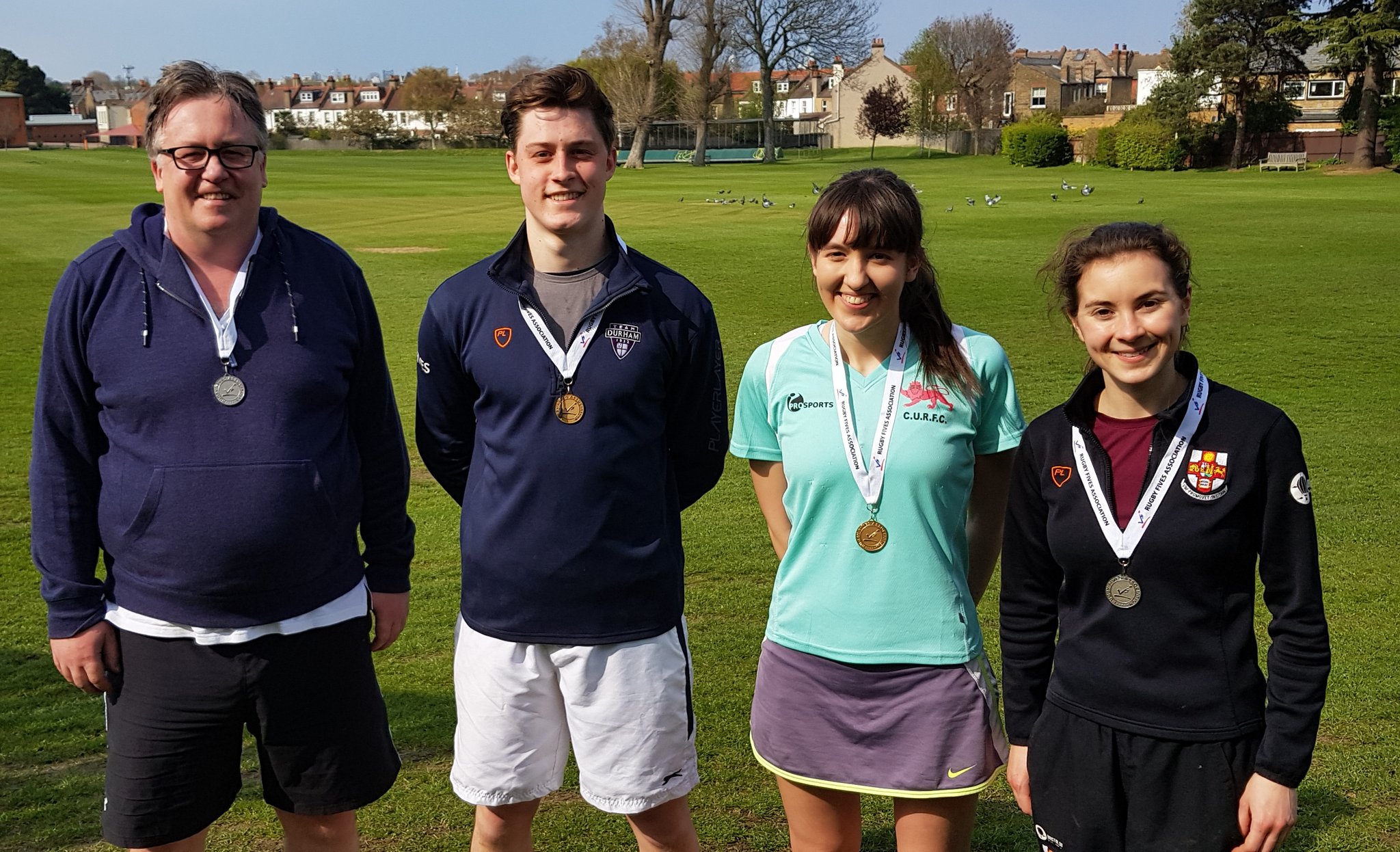 In the final, an exciting rematch of the first pool games between Helena & Douglas and Louise & Duncan, all players significantly upped their game. The first game went to Louise & Duncan 16-14, helped by Duncan’s unsuspecting drop-shot returns. In the second, however, Douglas’ powerful serves and Helena’s strong retrieving meant they made it one game all, winning 15-11. Despite some tactical water breaks by Duncan and some excellent nicks, Helena & Douglas pulled through in the third to become the very worthy winners of the inaugural Rugby Fives Mixed Doubles tournament. The final score was 14-16, 15-11, 15-9 — an excellent finish to an exciting day of fives.
