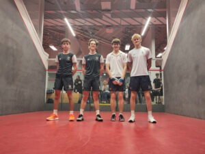 A healthy 13 pairs from 5 different schools contested this year’s Schools Winchester Fives Doubles Championship on the new courts at Winchester College. The initial group stage consisted of two large round robins, giving pairs 6 and 5 matches respectively to establish 4 leading pairs, who then contested the semi-finals while the remaining 9 pairs fought out the Plate.