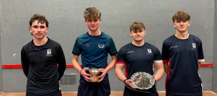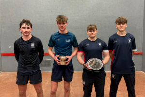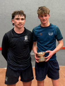Hector McFarlane reports: 15 schools boys from three schools (Edinburgh Academy, Merchiston Castle and Fettes College) entered the 9th edition of the Scottish Schools’ U18 Singles. The morning’s play consisted of 4 groups of players battling it out to place themselves into the Cup or the Plate. Group A was the tightest, with three players all winning one game, one of them, top seed Jock L (E.A.), winning all of his matches. Total points was the deciding factor, which saw Freddie J (E.A.) sneak into the Cup. Group B went to seeding as Fergus F (MCS) won all his games, dropping only 2 points in the process. A commendable effort should be noted by Robert J (E.A.), who did not look out of place despite still being U14. Group C saw Lochie F (Fettes) win three tight games, 11-6, 11-8, 11-9, to progress as group winner, while last year’s runner-up Reggie H (MCS), struggling with a bruised hand, slipped into the Plate. Group D had only three entrants, so games were played to 15, with Ludo C (E.A.) taking top spot ahead of James R (MCS).