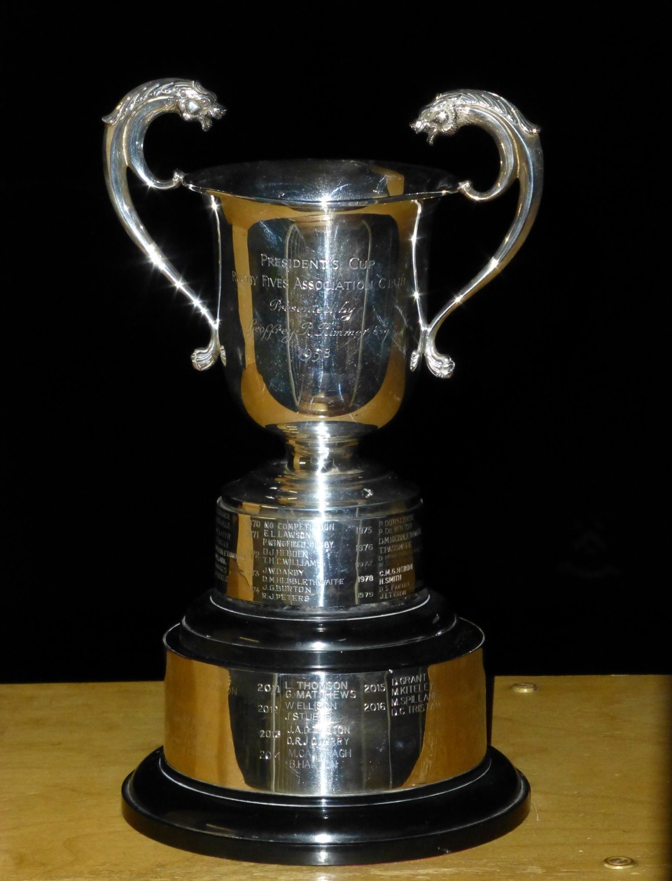 Conceived in late 1957 by RFA Club founder and President Geoffrey Rimmer as a ‘Club Doubles Competition on a handicap basis’, the President’s Cup took a few years to shake down into the all-day event we know and enjoy today. For the first ten years of its existence, the competition was played by arrangement over several evenings, the draw for partners having been done by a sub-committee, with a grand final and social evening at the Hampstead Squash and Rugby Fives Club. 26 members entered the first competition, won by Colin Hindson and Peter Snowsill, who beat Adam Horner and Tom Jones 16-15, 12-15, 15-4 on a foggy evening in December 1958. Geoffrey Rimmer donated and presented a fine engraved silver trophy and a pair of ‘Crown and Rose’ pewter tankards to the winners.