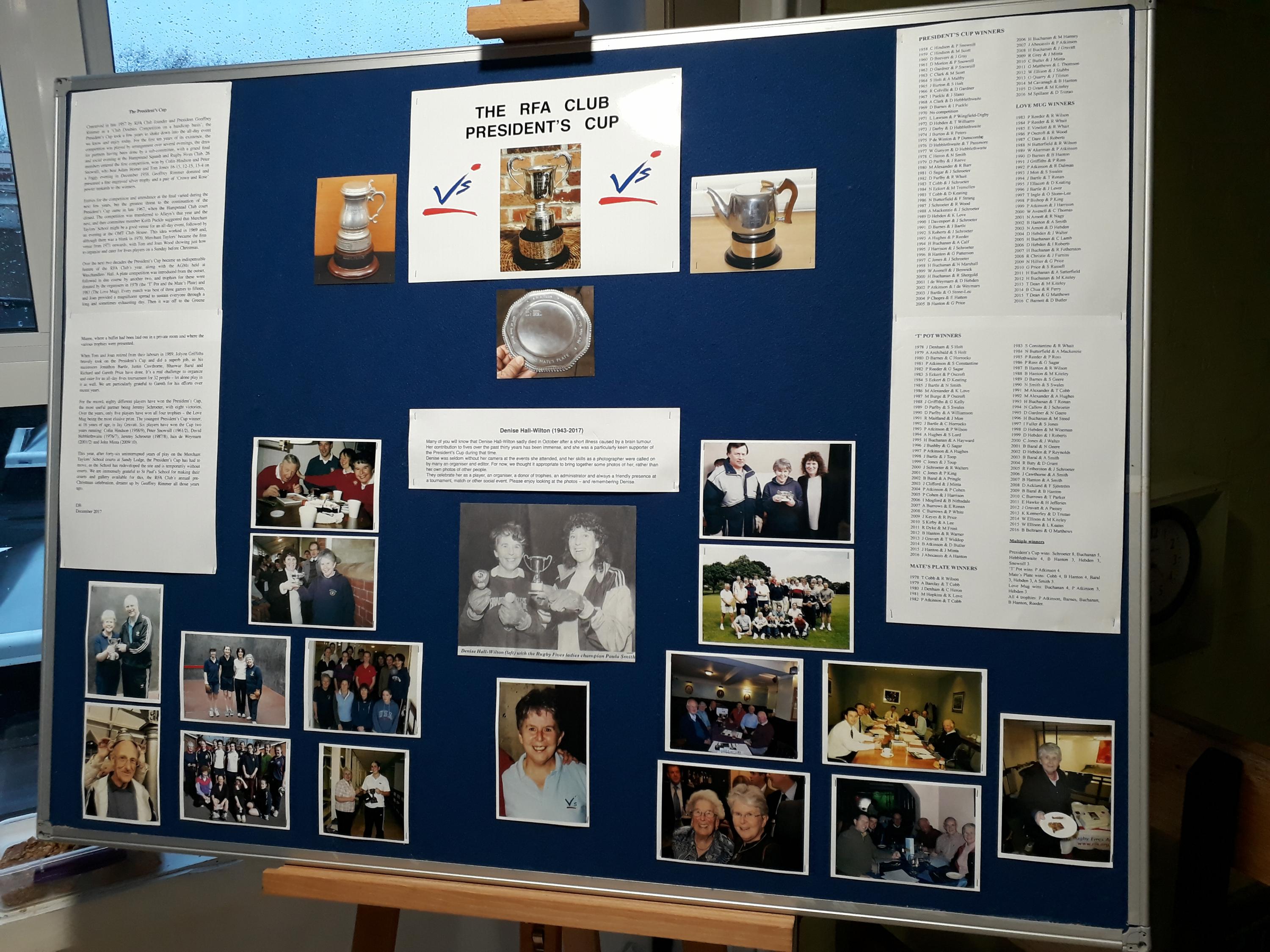 It was the FIRST President’s Cup since the death of Denise Hall-Wilton, whose absence was keenly felt by many participating. In her memory David Barnes mounted a photographic tribute to this player, supporter, administrator, photographer and great champion of Fives for Men and Women. The tribute can be seen at the end of this report, along with David’s account of the history of the Cup.