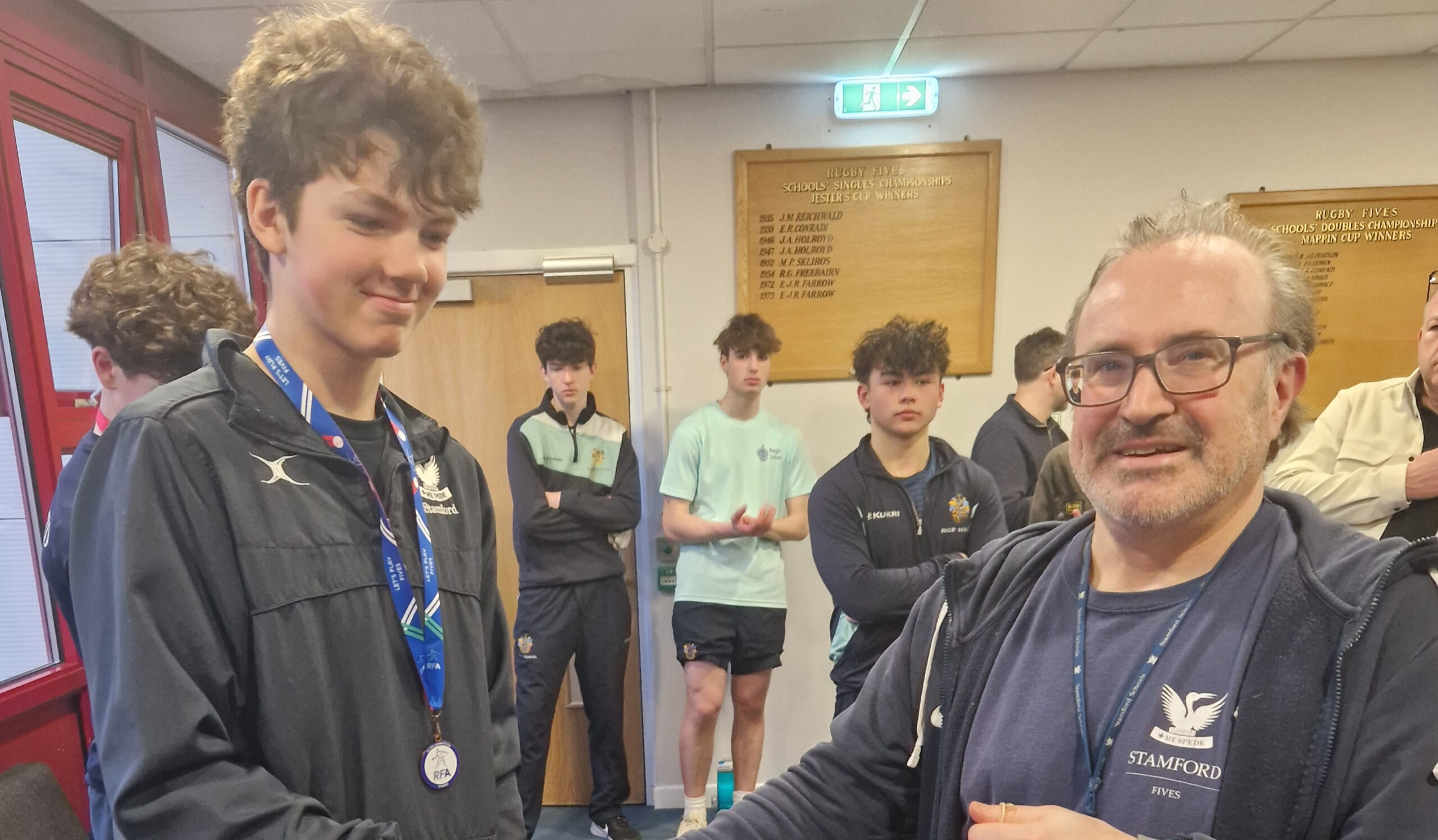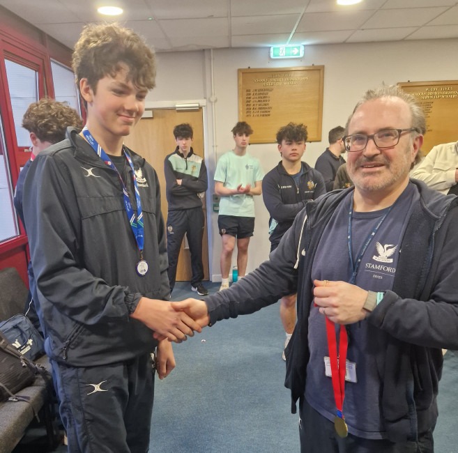 Coach and organiser congratulates Stamford medallist