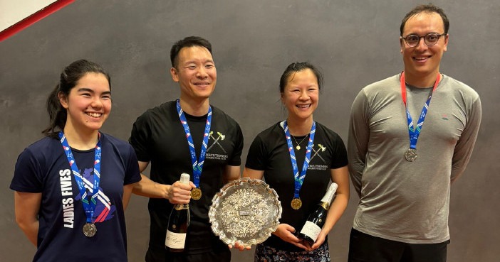 STOP PRESS 9 pairs contested the Rugby Fives National Open Mixed Doubles Championship on the courts at the Cambridge University Sports Centre. After group matches were completed two tightly contested semi-finals were played, from which Shinan Zhang & Penn Chai emerged to play Camille Beattie & Theo Parker in the final, which Shinan & Penn won. Meanwhile a truncated Plate was contested, from which Martha Nugent & Patrick Harrison emerged victorious.