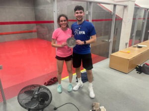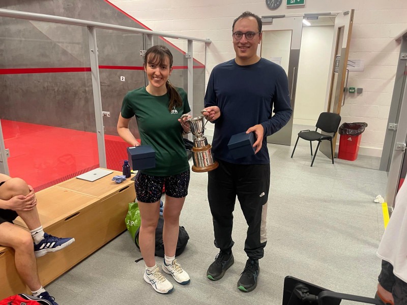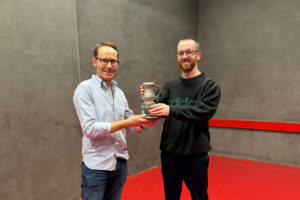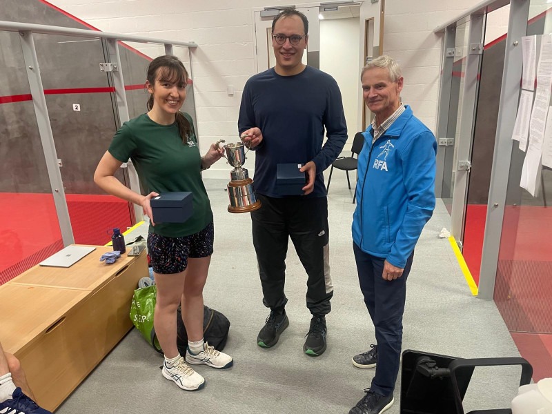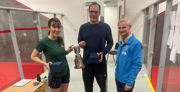 The President’s Cup always attracts dedicated followers and over the past few years Abbie Evans and Adam Amine-Piekos have been two of those. This year Adam celebrated his first match win in the tournament, but unfortunately this led to a game against his off-court partner Abbie. Deep in thought, Adam wondered if the RFA had considered providing a relationship councillor for support in this scenario. There was no need as Abbie served out onto the buttress numerous times, indeed quite possibly more times than any other player on the day, and with Lewis Keates moved on to the next match. Adam retired with a cup of tea and a piece of cake — everyone’s a winner at the President’s Cup.