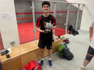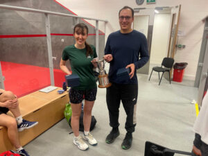 The final of the main event was actually rather one-sided, with Helena Tunks and Theo Parker beating a tired Chris Davey and Nick Whitney in two games. This was Theo’s first win and Helena’s second and the day was not plain sailing as they only scraped through the first round, 15-12 in the third against Chris Jones and Andy Passey. Chris D and Nick had endured a three-game quarter-final and also a semi-final against Gwydion Wiseman and Savanna Leboff that went to the wire, 16-14 in the third.