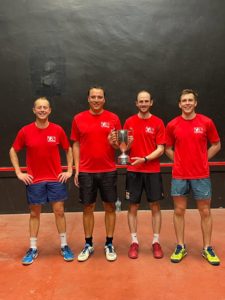 Group 2 was described by many as the group of death, with three very strong sides in WoE2, Derby Moor 1 and the second seeds, the Old Paulines. The main topic of discussion going into the event was what team the Old Paulines would field at each stage. Constrained by availability (and potentially by the fact a host of their players were playing for different teams), up until Saturday morning it was unclear to all but reigning National Doubles champion and team captain Charlie Brooks who would be taking part. Rumours abounded that Ben Beltrami was flying in from Dubai specially for the weekend, or that Ed Kay had taken his gloves with him on holiday and so would be able to fly into Heathrow and come straight to the courts for the Sunday morning. However, neither proved to be the case and in the end Charlie Brooks lined up alongside three current St Paul’s pupils for their first match against Old Rugby 2. All the uncertainty didn’t seem to do the Paulines much harm though, and they duly won their first match with relative comfort. As the tournament progressed Charlie would bolster his line-up with journey-man tournament player Sam Russell (currently ranked 11 in the country) and – on Sunday – with reigning National Singles champion and number 1 ranked player in the country, Dan Tristao. As a result Old Paulines lived up to their seeding, winning all their games and progressing to the semi-finals on the Sunday. That just left WoE2 and DM1 to fight it out for second place. In what was one of the closest games of the weekend WoE2 edged it 100 points to 91 and hence cantered in second place in the group. Final standings in the group were 1st Old Paulines, 2nd WoE 2 (295 points), DM1 (224 points) and 4th Old Rugby 2.