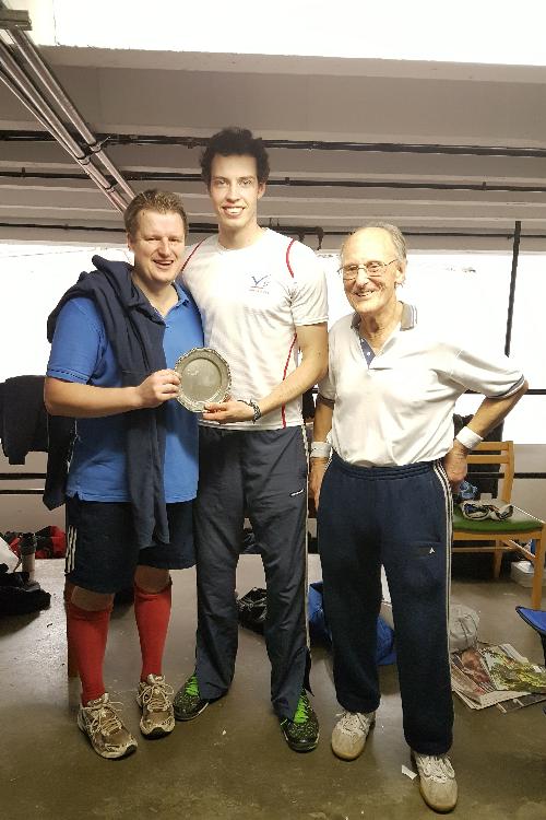 With little need to wear a paper crown Guy Matthews also provided on-court entertainment, not just for his bemused partner Ben Beltrami and the opposing pair but for all the chilly spectators at 7.30pm who watched Guy & Ben wrest the Mate’s Plate from Hamish B. & Jon Peterson. Guy now nearly has the full tea service: just the T-Pot to win and he’ll join an illustrious club whose full list of members #OnlyDavidBarnesKnows, but certainly Hamish belongs in it.