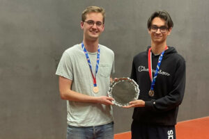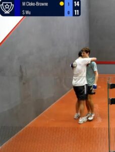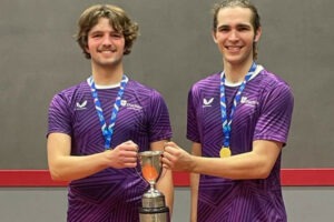 STOP PRESS A new Singles champion emerged from an entry of 32 players, with Cambridge’s Marcus Cloke Browne beating Shiloh Wu from Oxford in the final. There were two Plates, one for men, won by Aaditya Deshmukh, who beat fellow Oxford player Alikhan Murat in the final, while Yvonne Tang of Bristol beat Abbie Evans of Oxford in the Women’s Plate. In the Doubles the top seeds met in the final, with Stuart Scott & Isaac Weaver retaining the title for Durham in a high quality final against the Cambridge pair Cloke Browne & Thursfield on their home courts. A strong Oxford squad had more success in the plates, with Abbie Evans pairing up in the Women’s Plate with Bristol’s Yvonne Tang, who did the Plate double. The Men’s Plate was won by a mixed pair of Rob Menhart from Cambridge and his partner Ben Jourdan, who as organiser particularly deserved his trophy. Huge thanks to Ben and his co-organiser and former champion Andrew Boyd, to Marcus for master-minding the live-streaming, to the various commentators and the General Secretary for their work in communications, and to the players for their constructive part in a long but action-packed weekend of Fives.
