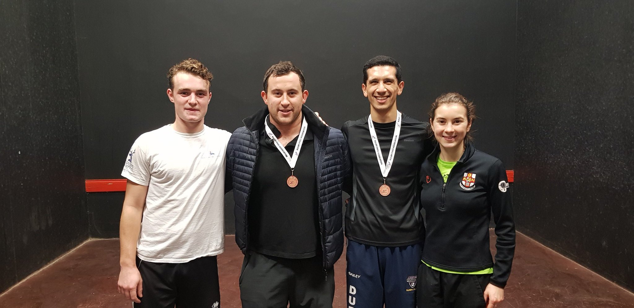 In the doubles, Watkinson & Butler vs. Shaw & Beltrami was the pick of the quarter-finals. Tom’s hard-hitting and Dave’s doubles experience had their opponents on the ropes early, though once Ben and Matt found their groove they recovered to win 11-9, 11-6. Third seeds Arnold & Parker progressed quickly past Aquilina & Hanton, whilst Ellison & Kay also moved to the semis easily. Meanwhile, the Exeter pairing of Kennerley & Savery had Dan2 in serious trouble! Savery’s powerful right hand was finding left and back-wall nicks with ease, whilst Kennerley’s clever dropshots and lobs kept the previous champions honest. In all of this high-quality fives the enjoyment was apparent, with grins on the faces of players and spectators alike; it was an incredible advertisement for the spirit in which the game should be played, and both pairs were applauded off court after Dan & Dan had squeaked through 11-8, 12-10.